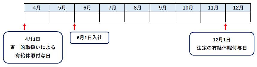 例として6月1日が入社日、4月1日が斉一的取扱いによる有給休暇付与日の場合で紹介します。