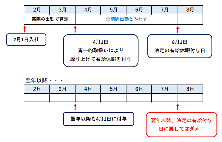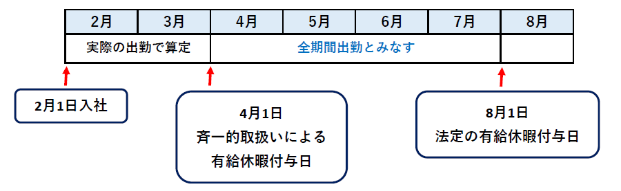 この場合、斉一的取扱いにより4月1日に有給休暇が付与されます。本来の付与日である8月1日までの期間である4月~7月が短縮された期間となります。この4月~7月は全期間出勤したことにし、2月~7月までの6ヵ月間で8割あるか計算しなさいということですね。